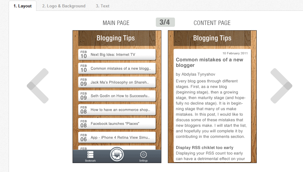 Then edit how your app should look by editing the layout,background etc.You have to choose from the existing 3 or 4 themes.You can also upload your images for logo n background.