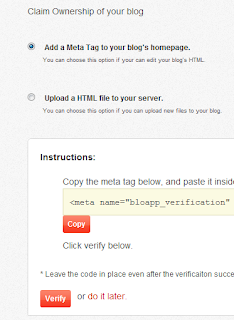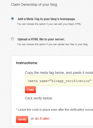 Then claim ownership by adding a meta tag to your page.This can be done by copying and pasting the code in your blog html